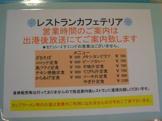 | レストランは、基隆停泊中の21:00〜21:30、翌朝の8:00〜8:30、そして12:00〜12:30の営業です。 上のメニューは、夜のメニューです。フェリーの中にしては良心的な値段ですね。 ちなみに朝は、和食・洋食が500円、サンドイッチが700円でした。 昼のメニューは、上よりも種類が多く、沖縄そば500円、ゴーヤーチャンプルー定食800円、エビフライ1000円(?)などが加わってます。 夜と朝は予約不要ですが、昼の営業は、10:00〜10:30の間に、レセプションで食券を購入する必要がありますので注意が必要です。 |