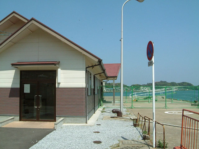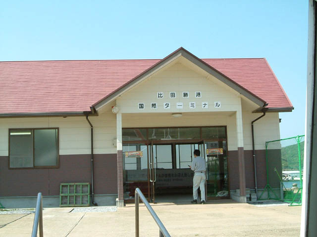 | で、これが「国際ターミナル」です。 なんだか、水産加工会社の事務所か、悪く言えば物置のような建物なのですが… 見ての通り、小さな建物でありますが、中には、空港や博多港と同じ、出入国検査場があります。 しかし、この建物には、出入国検査場と、小さな待合室以外に、何もありません。 #それはそうと「国際ターミナル」という看板がどこにもないので、戸惑いました。