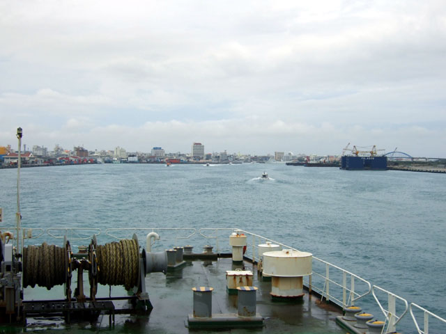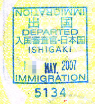 | 上の写真の通り、ロビーに仮設の出国手続き所が開かれます。 なお、乗船手続き(乗船券の確認)もここで行われます。 沖縄港でもそうだったですが、ここでは、乗船名簿とのチェックが念入りに行われます。 万一、乗船名簿とあわなければ「密入国(密出国?)」ですから… スタンプは「ISHIGAKI」と、石垣港専用のバージョンになっております。 すべての手続き後、しばらくしてから、出港となります。 |