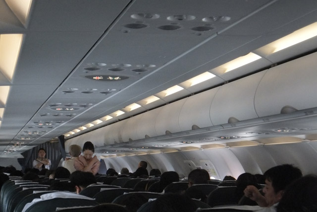 | 機材は至って普通のA320。座席の配置も「一般的なLCC仕様」になっていて、日本で言うところのピーチや(おそらく)ジェットスターと大差ないです。ただ、前2列だけは上級クラスになっており、座席間隔が広く、また機内食も出る様です。(ということで、一般席は何も無しです。ま、春秋航空はLCCですから) 座席まわりも普通に清掃が出来ており、はっきり言って、中国国内線で飛んでいる大手航空会社より「まし」に思えました。 で、これが春秋名物の「機内体操」です。 |